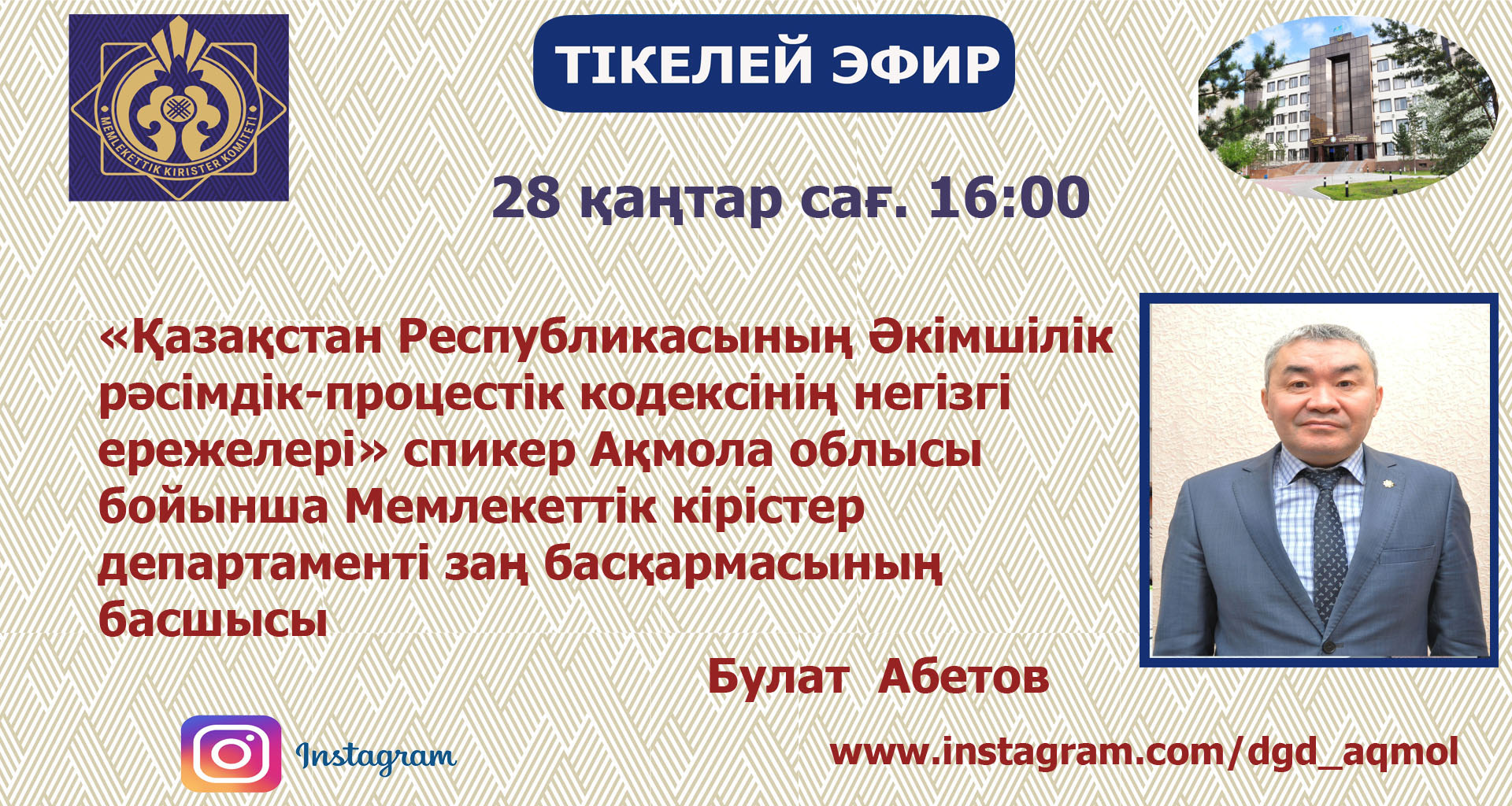 Департамент государственных доходов по Акмолинской области сообщает о проведении 28 января 2022 г. в 16.00 ч. прямого эфира на странице Департамента в социальной сети INSTAGRAM по ссылке www.instagram.com/dgd_aqmol на актуальную тему: «Основные положения Административно процедурно-процессуального кодекса Республики Казахстан».