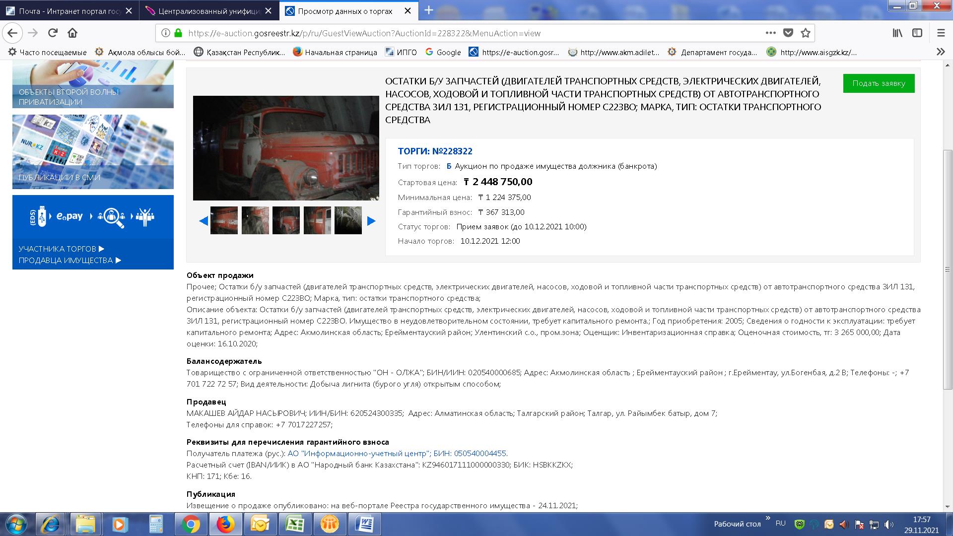 Департамент государственных доходов по Акмолинской области, сообщает что, согласно Закона Республики Казахстан «О реабилитации и банкротстве» осуществляется Продажа имущества (активов) должника, в отношении которого решением суда применена процедура банкротства. Начало электронных торгов – 10.12. 2021 г. в 12-00часов. Информация о проведении электронного аукциона имущества должника ТОО "Он Олжа», размещена на веб-портале реестра по электронной ссылке https://e- auction.gosreestr.kz/p/ru/auction-guest-list.